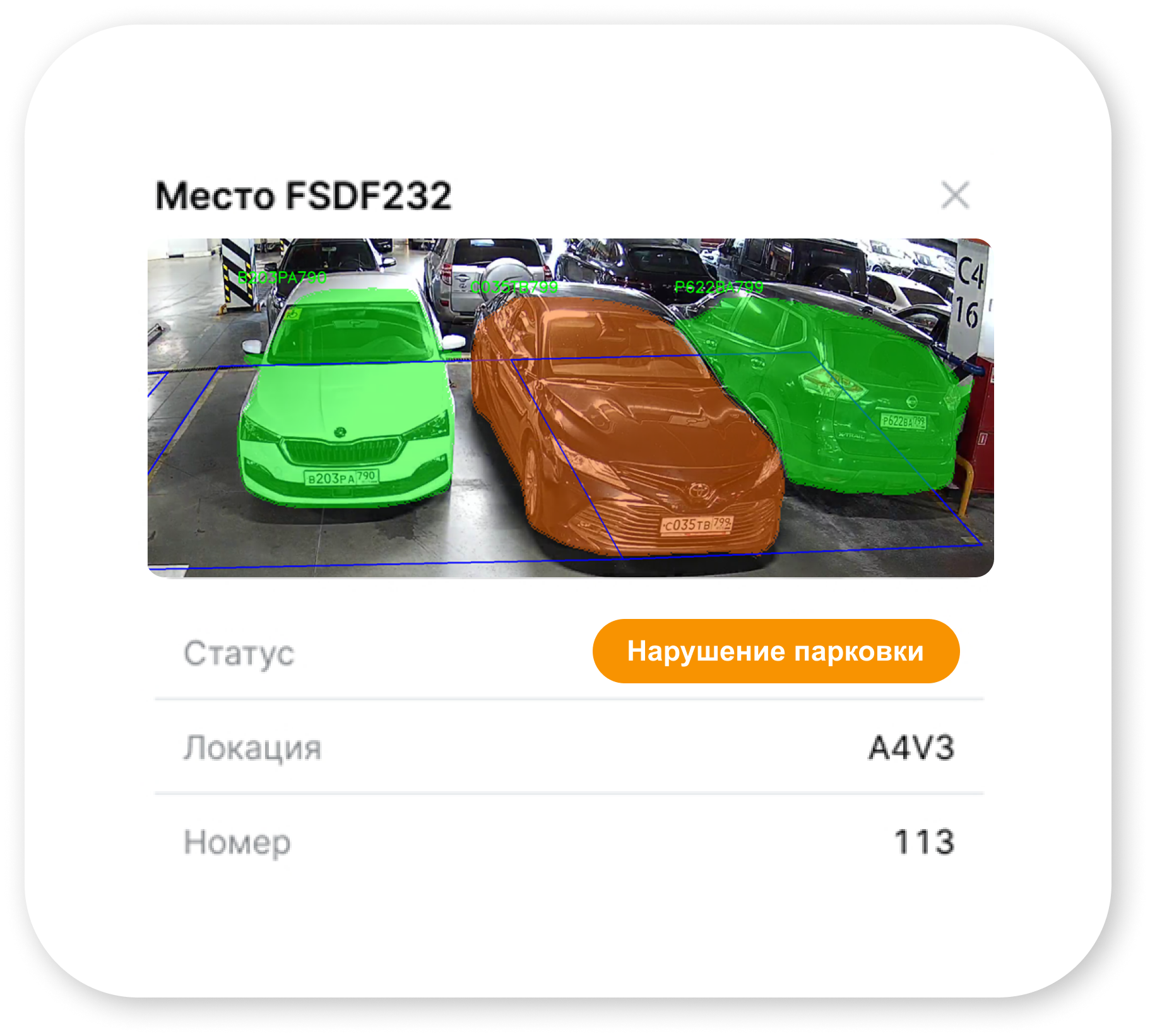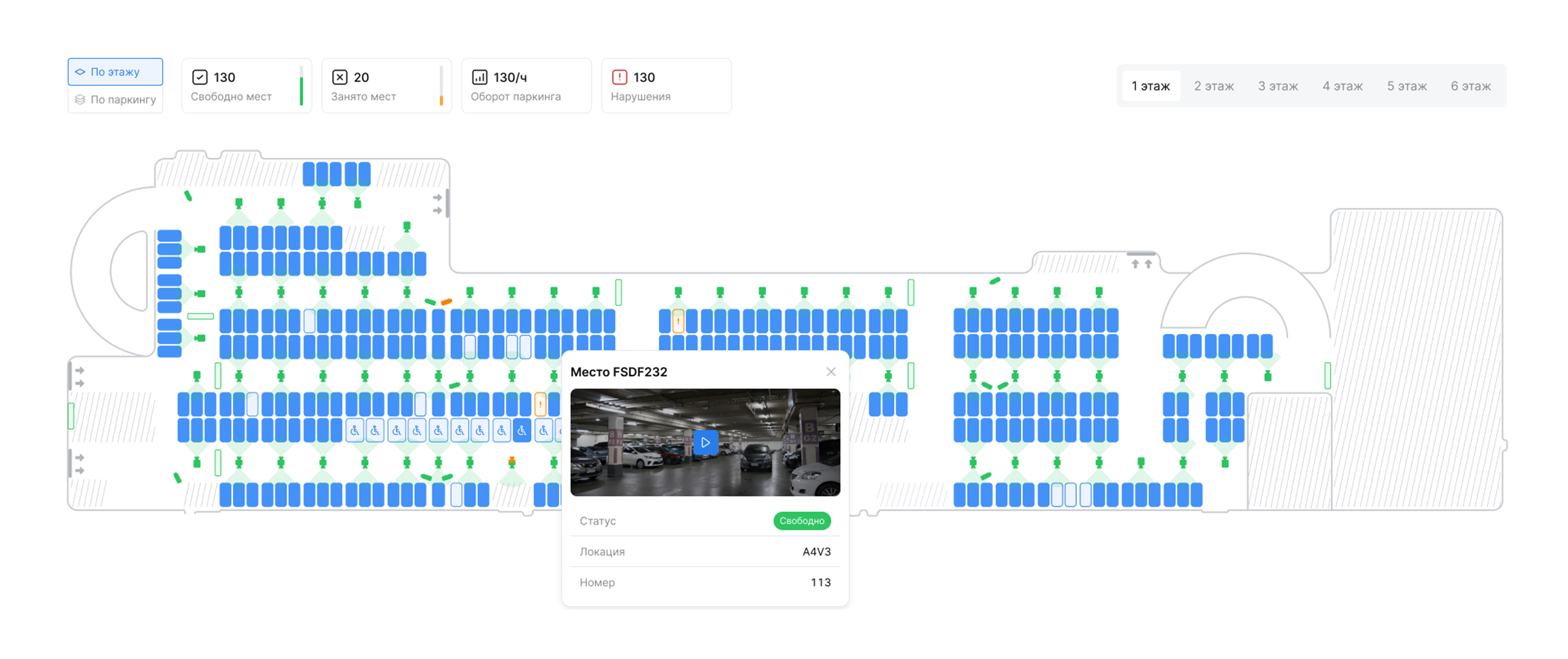 Интерактивный дашборд позволяет отслеживать статус всех парковочных мест на разных этажах, а также получать уведомления о нарушениях.